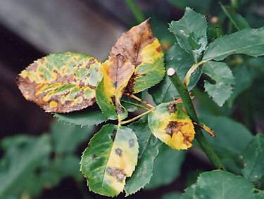 Otherwise known by the Latin name of Diplocarpon Rosae, blackspot is a prolific fungus that manifests itself as black spots on both sides of the leaves. The initial spots progress and become larger. The disease will spread through the whole leaf and turn it from green to yellow. The leaves will then drop off and eventually you will end up with a very bald rose that looks very sorry for itself.